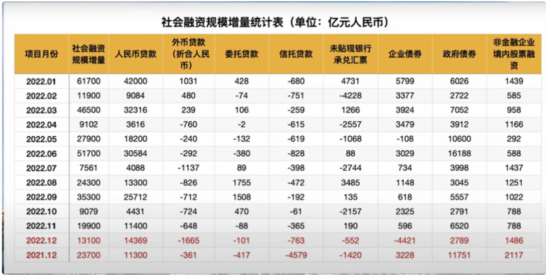如表: 2022年12月社融相比于2021年12月腰斩,主要在于政府债券和企业债券大幅度缩水。政府债券主要是因为有一个前置发行的动作,大部分在上半年就已经发行完毕。2021年发行的也比较多。企业债券主要是理财产品经过大量的赎回,债券市场收益率上行,大量企业取消发行债券。