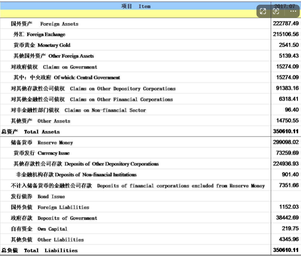 基础货币是央行真实印出来的钱,在如下图,央行公布的资产负债表里,有一栏叫储备货币,差不多 29 万亿左右其实就是基础货币,其中 23.5 万亿货币发行,7 万亿本币。 货币发行”(流通中的现金M0与银行库存现金), 其他存款性公司存款”(即准备金存款,包括法定存款准备金与超额存款准备金)基础货币的创造过程也是来源于央行资产端的扩张。