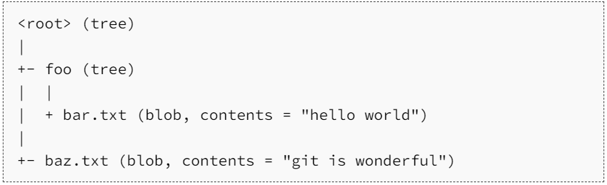 这个顶层的树包含了两个元素,一个名为 “foo” 的树(它本身包含了一个blob对象 “bar.txt”),以及一个 blob 对象 “baz.txt”。